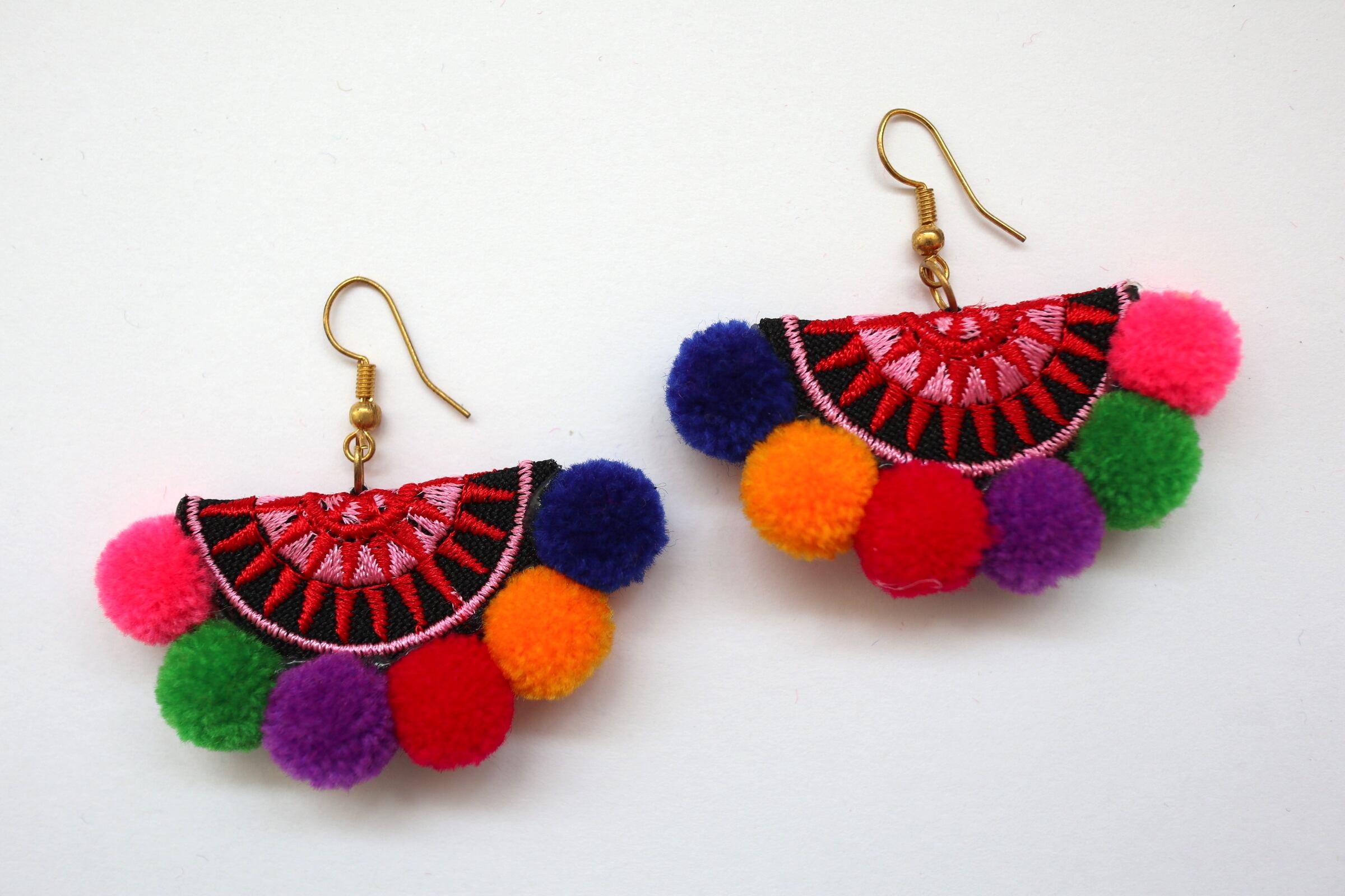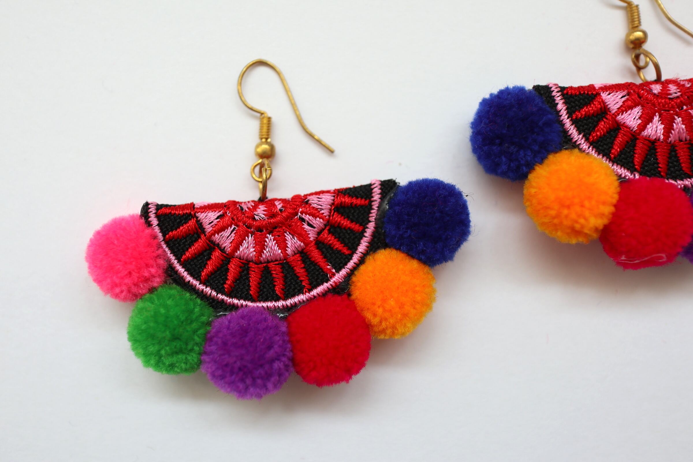 タイ・モン族らしいカラフルなポンポンがあしらわれた扇形ピアス。ふわふわとした見た目が可愛く、お手持ちのエスニック系アイテムにピッタリ。シンプルな洋服にはガーリーなテイストもプラス。見た目以上に軽いので着け心地も良いです。