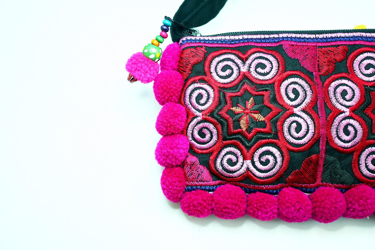 フチにポンポンがあしらわれた小さめポーチ。リップクリームなど、バッグの中でバラバラになりがちな小物をまとめて入れておくのに便利。独特な民族調の模様が印象的です。