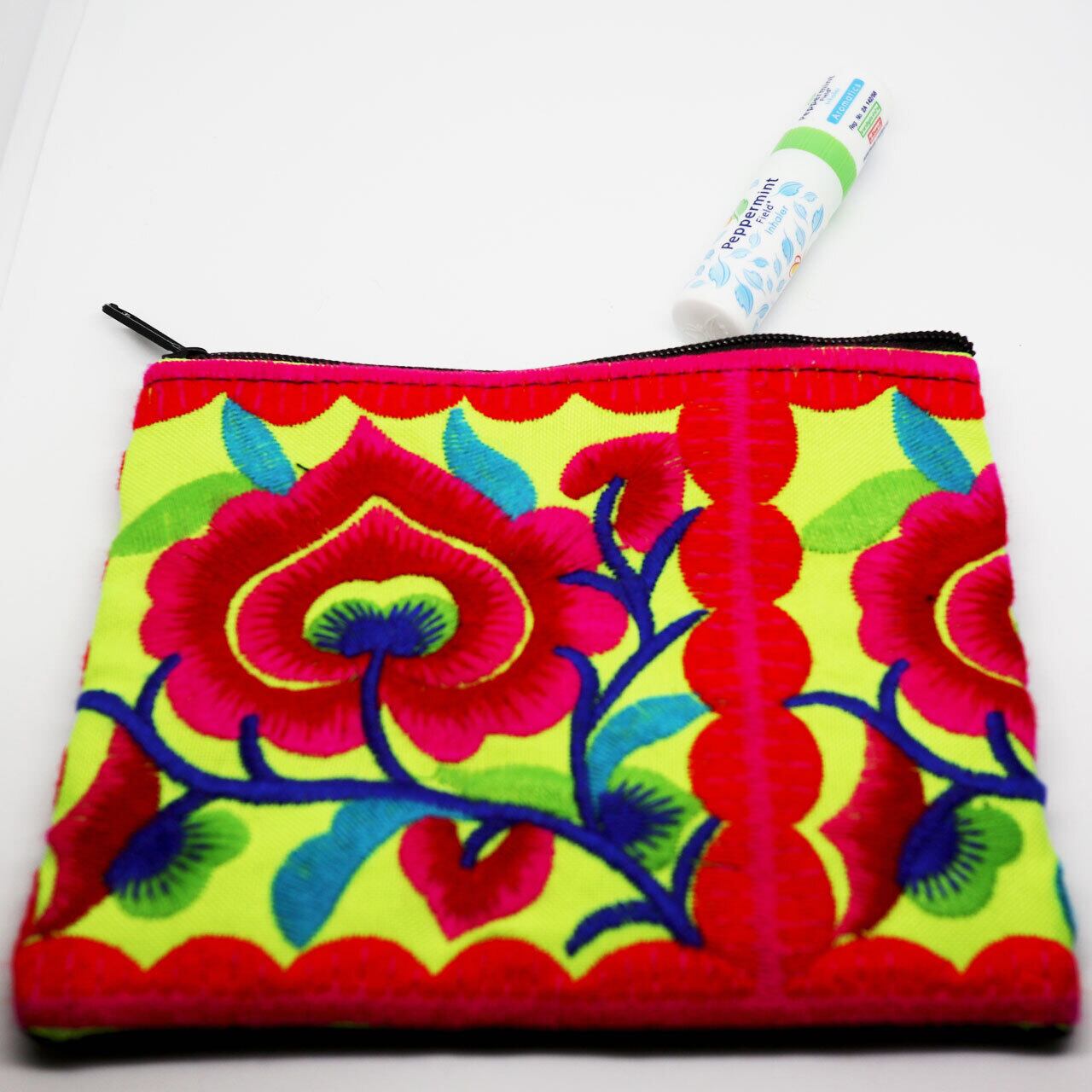 鮮やかな色使いが特徴の刺しゅう花柄ポーチ。