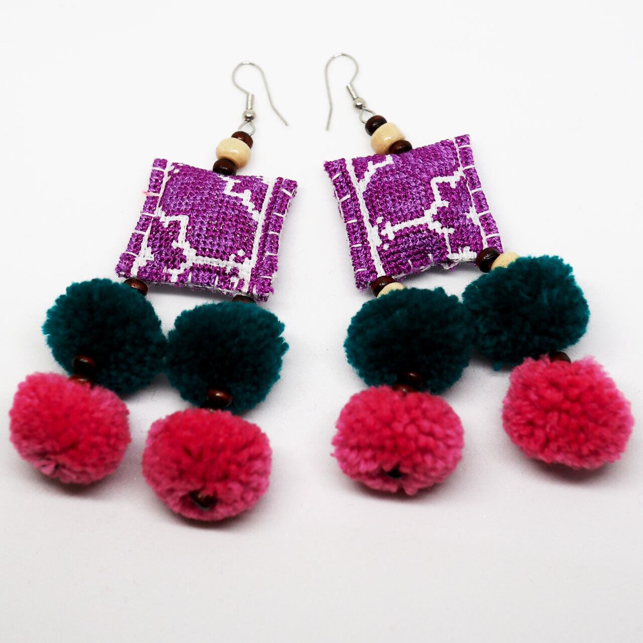 小さな四角いクッションのようなモチーフに、ポンポンが2本ぶらさがった存在感あるピアス。ウッドビーズもあしらわれ、細かい部分にも可愛さが詰まっています。